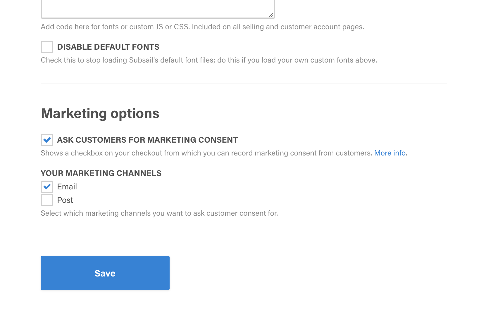 You do not need to enable and use the following tools if you only plan to send emails or mail to your subscribers about their purchases, subscriptions or issues that relate to their subscriptions (to “fulfil a contract” in GDPR terms). You do need to use these tools if you will send emails or mail unrelated to their purchases, such as newsletters. Important: Please understand the GDPR rules and regulations yourself. You are the “data controller” for your subscribers’ personal data and responsible for making sure that it’s handled and processed correctly. Subsail acts as your “data processor”.How to record marketing consent
