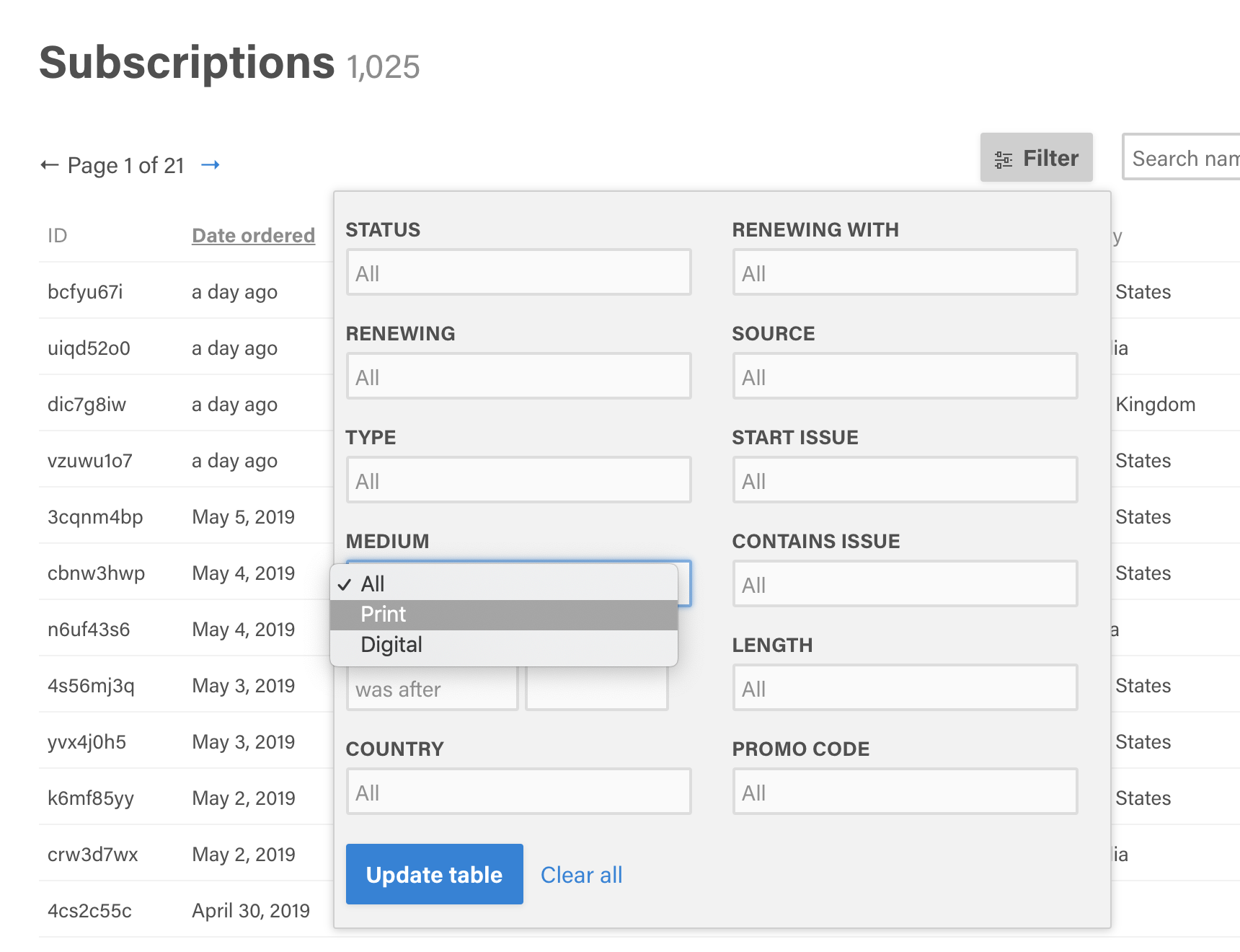 When subscriptions are purchased, the medium is saved to the subscription, so you can easily filter and export based on this data point.